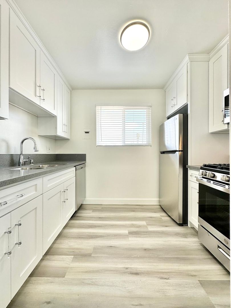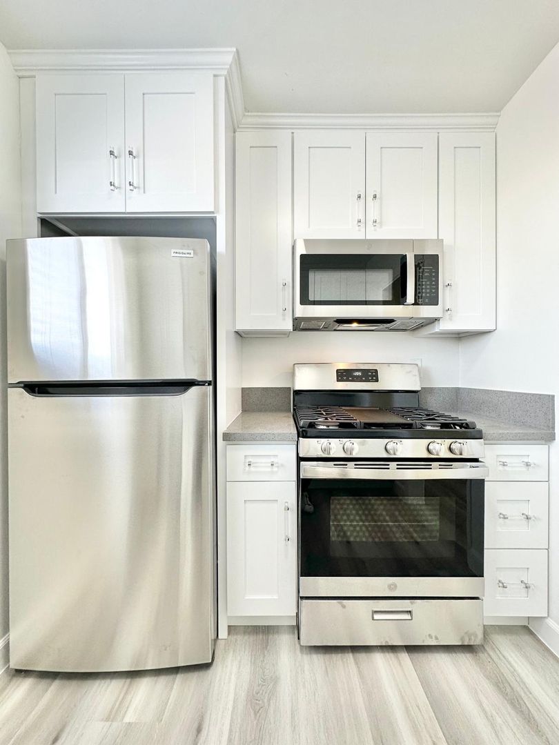 – Updated kitchen with white shaker cabinets and stainless steel appliances (stove/oven, refrigerator, microwave, dishwasher)