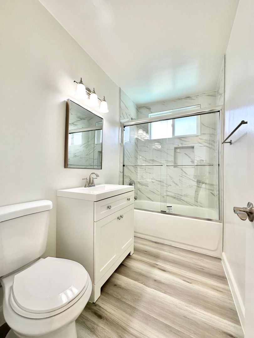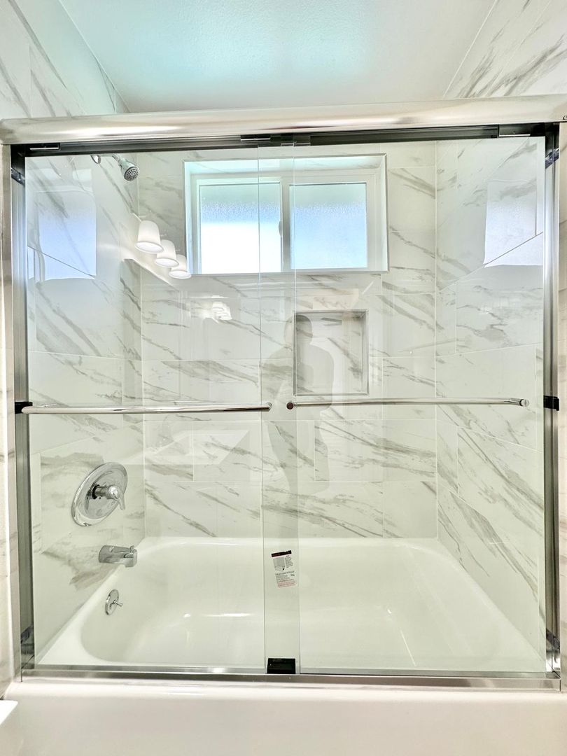 – Beautifully remodeled bathroom with tiled shower/tub enclosure and glass sliding doors