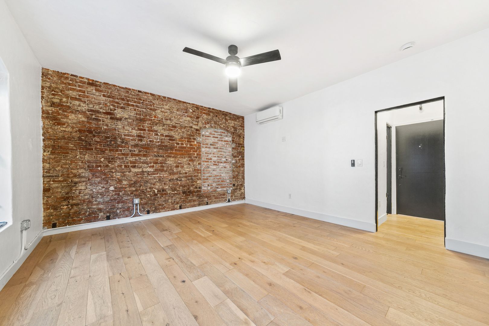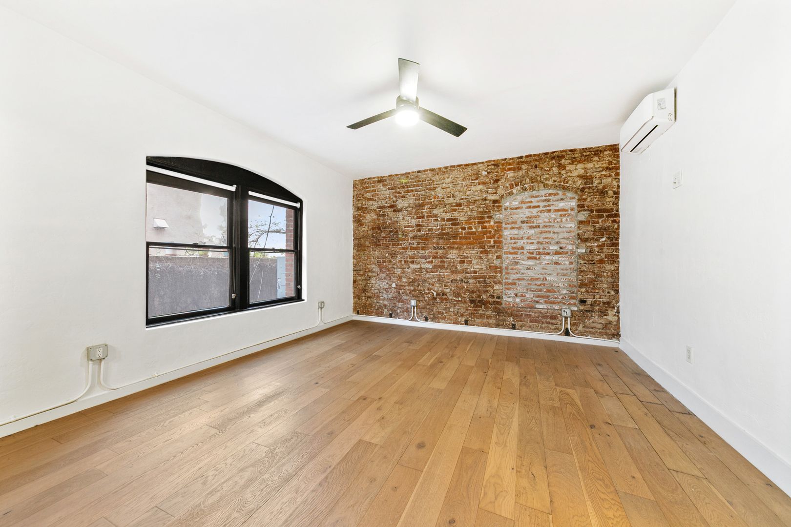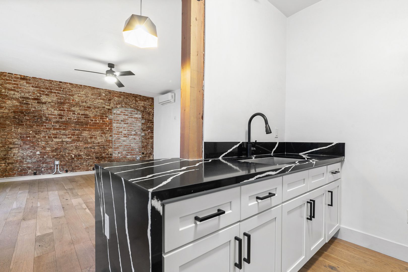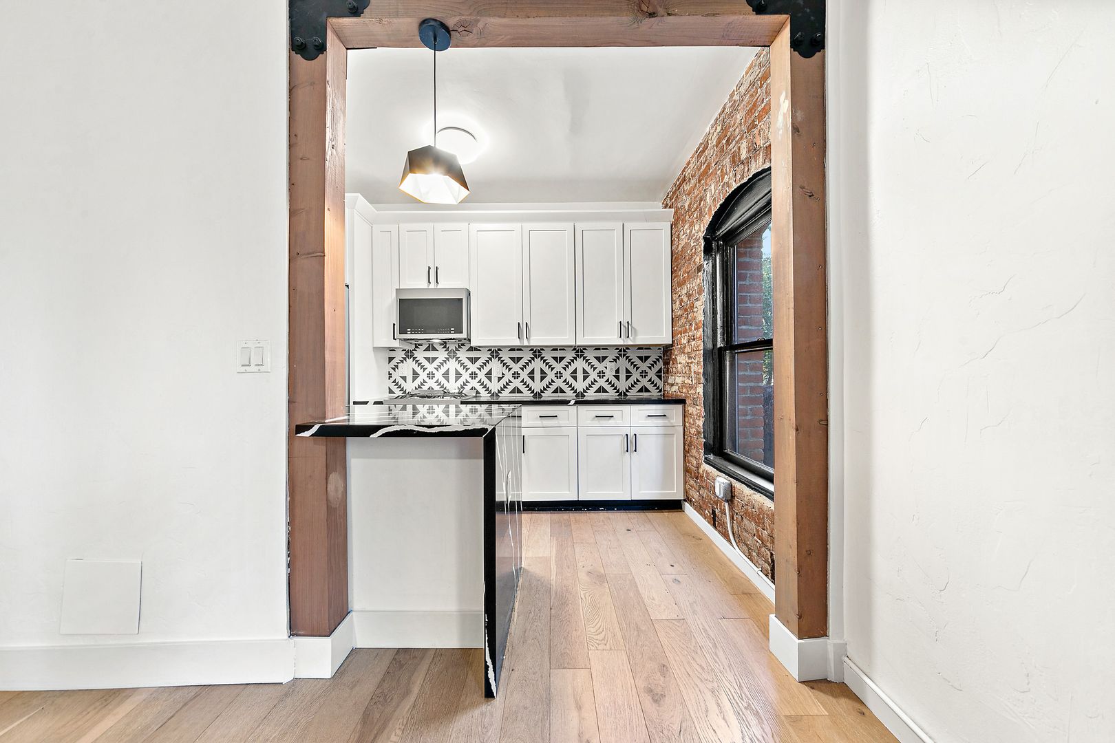 – Bright corner unit with exposed original brick accent wall for character and warmth